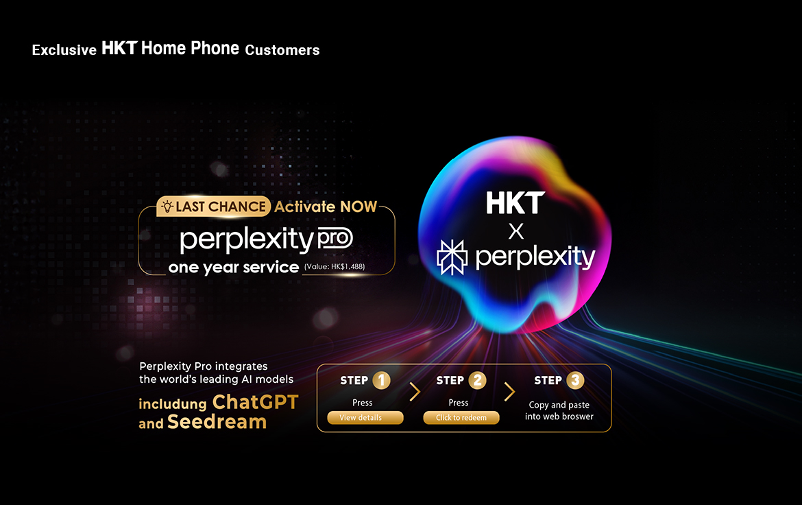 Eligible consumer customers who have subscribed to a designated HKT Home Phone service plan during the Promotion Period will be entitled to an e-coupon for redemption of Perplexity Pro Service for one (1) year for free (value at HK$1,488) (this “Promotion”). Relevant terms and conditions apply.